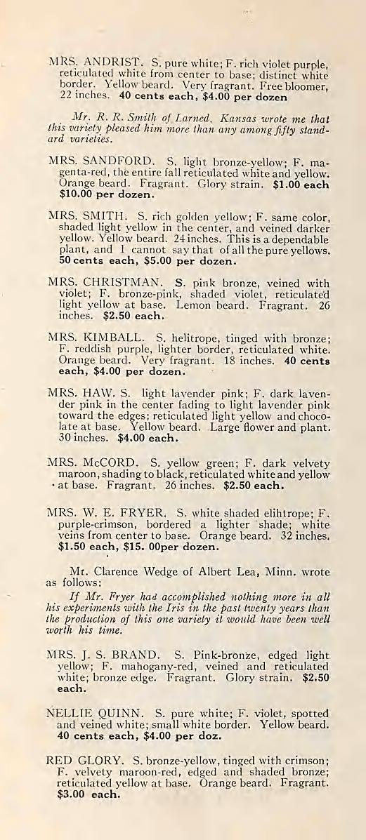 Mrs. Andrist was first listed in the 1919 ‘Fryer’s New Iris’ catalog as ‘Mrs. K. Andrist’, and as ‘Mrs. Andrist’ as early as 1921.